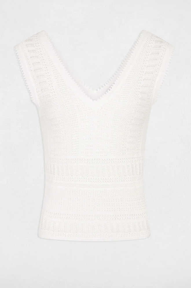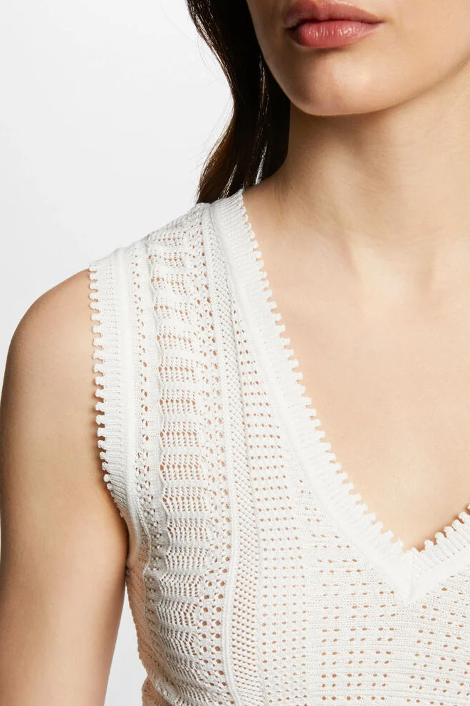 Jersey calado sin mangas Corte ajustado Escote en V Sin mangas Punto calado en la parte delantera Cuello en V en la parte posterior Borde festoneado en el cuello y las sisas