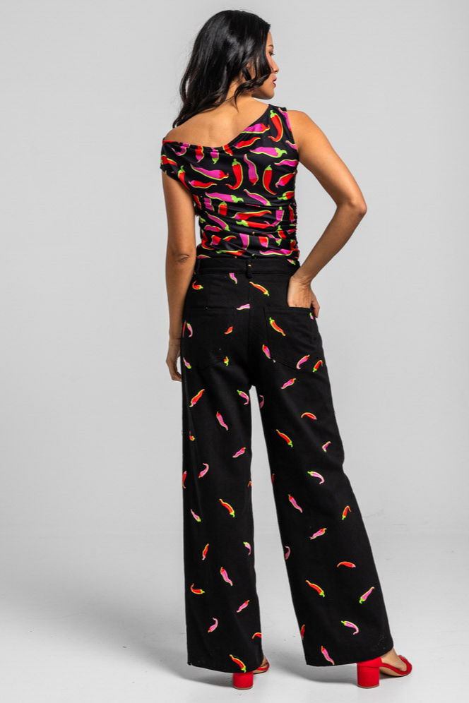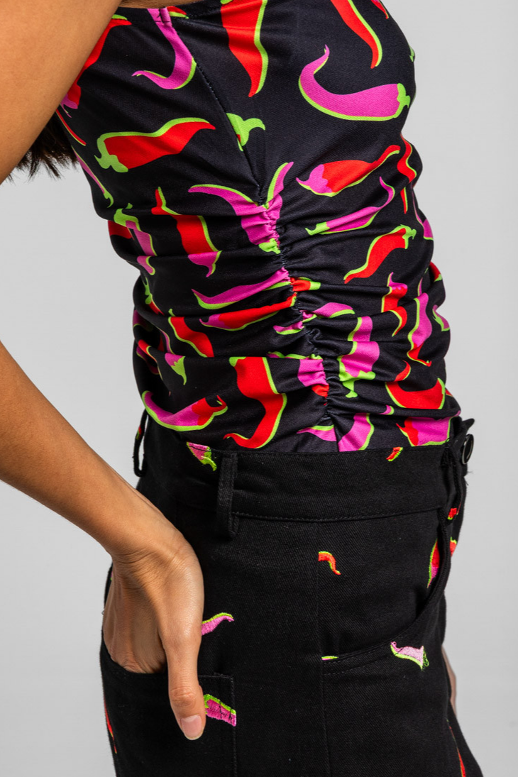 Picante: todo siempre con un poquito de picante - Top asimétrico negro con chilis rosas y rojos: Top de escote asimétrico de un solo hombro y manga sisa en tejido elástico. Diseñado con corte entallado con detalle de frunces en hombro y bajo pecho creando un efecto de drapeado. - 95% Poliéster y 5% Elastán. - Lavar a máquina en agua fría. No usar blanqueador. No usar secadora. Secar colgado a la sombra. Planchado a temperatura baja, por debajo de 100 ºC. Planchar del revés. No dejar la plancha parada sobre la prenda. Lavar con colores similares. - TALLA XS: Medida de pecho 37 cm, medida del bajo 40 cm y largo del cuerpo 58,5 cm. TALLA S: Medida de pecho 39 cm, medida del bajo 42 cm y largo del cuerpo 60 cm. TALLA M: Medida de pecho 41 cm, medida del bajo 44 cm y largo del cuerpo 61,5 cm. TALLA L: Medida de pecho 43 cm, medida del bajo 46 cm y largo del cuerpo 63 cm. TALLA XL: Medida de pecho 45 cm, medida del bajo 48 cm y largo del cuerpo 64,5 cm. - Las medidas de las prendas pueden presentar pequeñas variaciones debido al proceso de producción de hasta 2 cm. - Lolina ha realizado un gran esfuerzo para mostrar los colores de las prendas de la forma más cercana a la realidad posible. No obstante, queremos que tengas en cuenta que el color de las prendas que aparecen en pantalla puede estar sujeto a variaciones dependiendo de la calidad de tu ordenador o smartphone.
