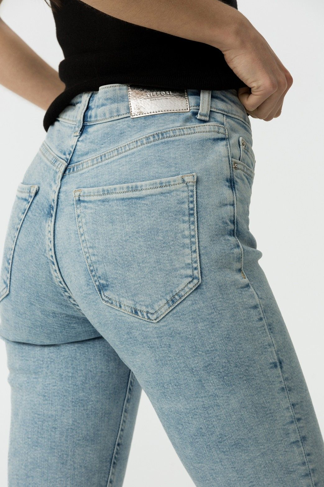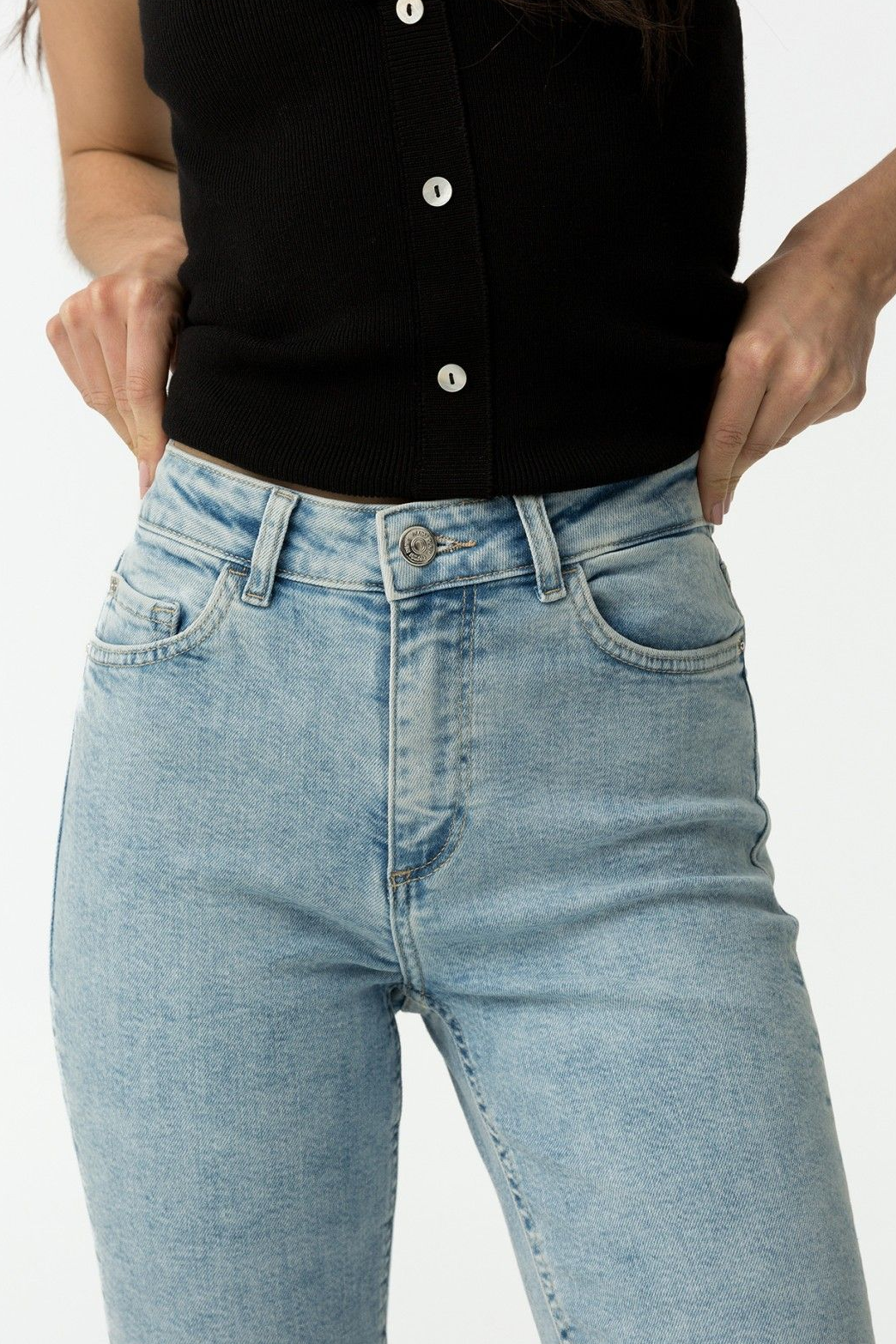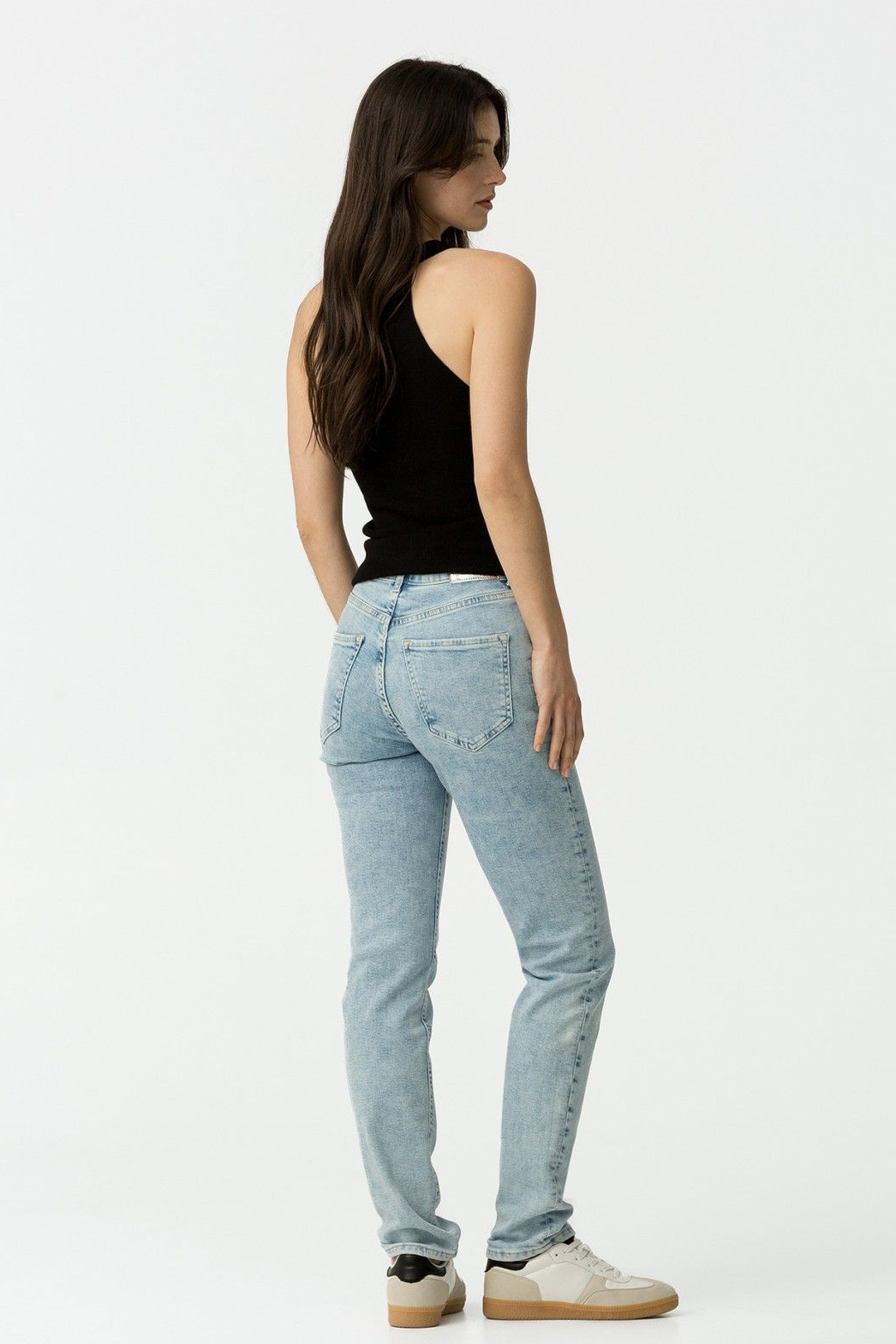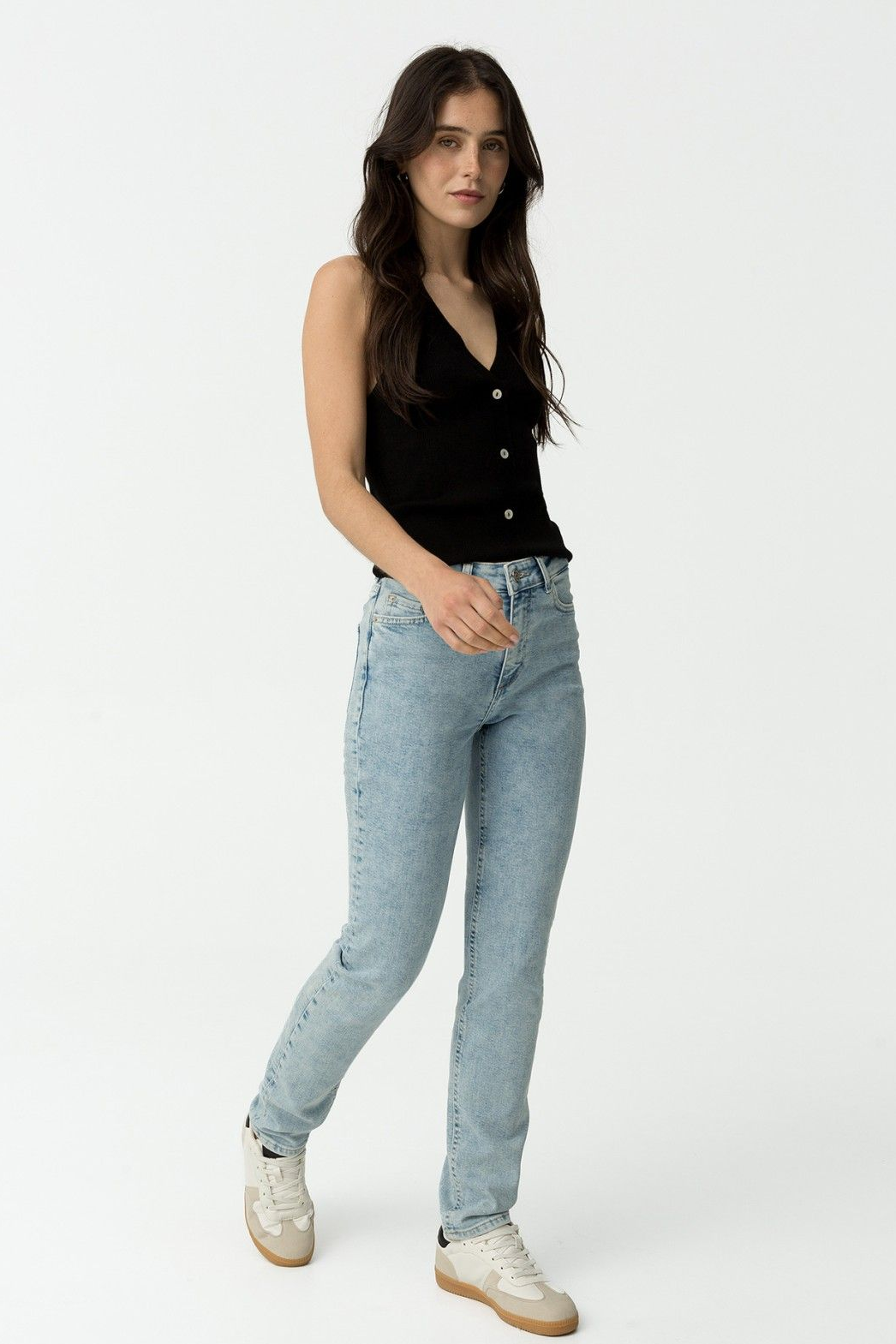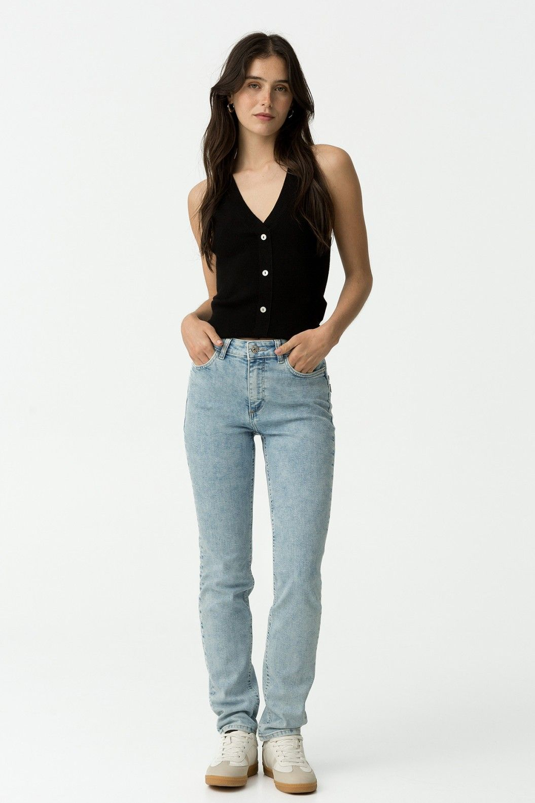 Pantalón de tiro alto con cinco bolsillos. Cierre frontal con cremallera y botón metálico.99% CO 1% EL