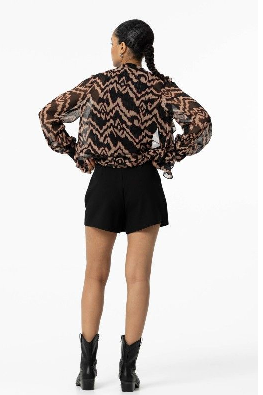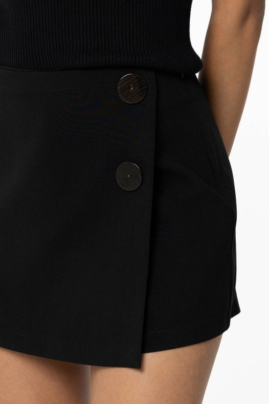 Falda shorts de tiro alto cruzada con botones falsos. Cierre lateral con cremallera oculta en costura.72% POLYESTER 23% VISCOSE 5% ELASTANE