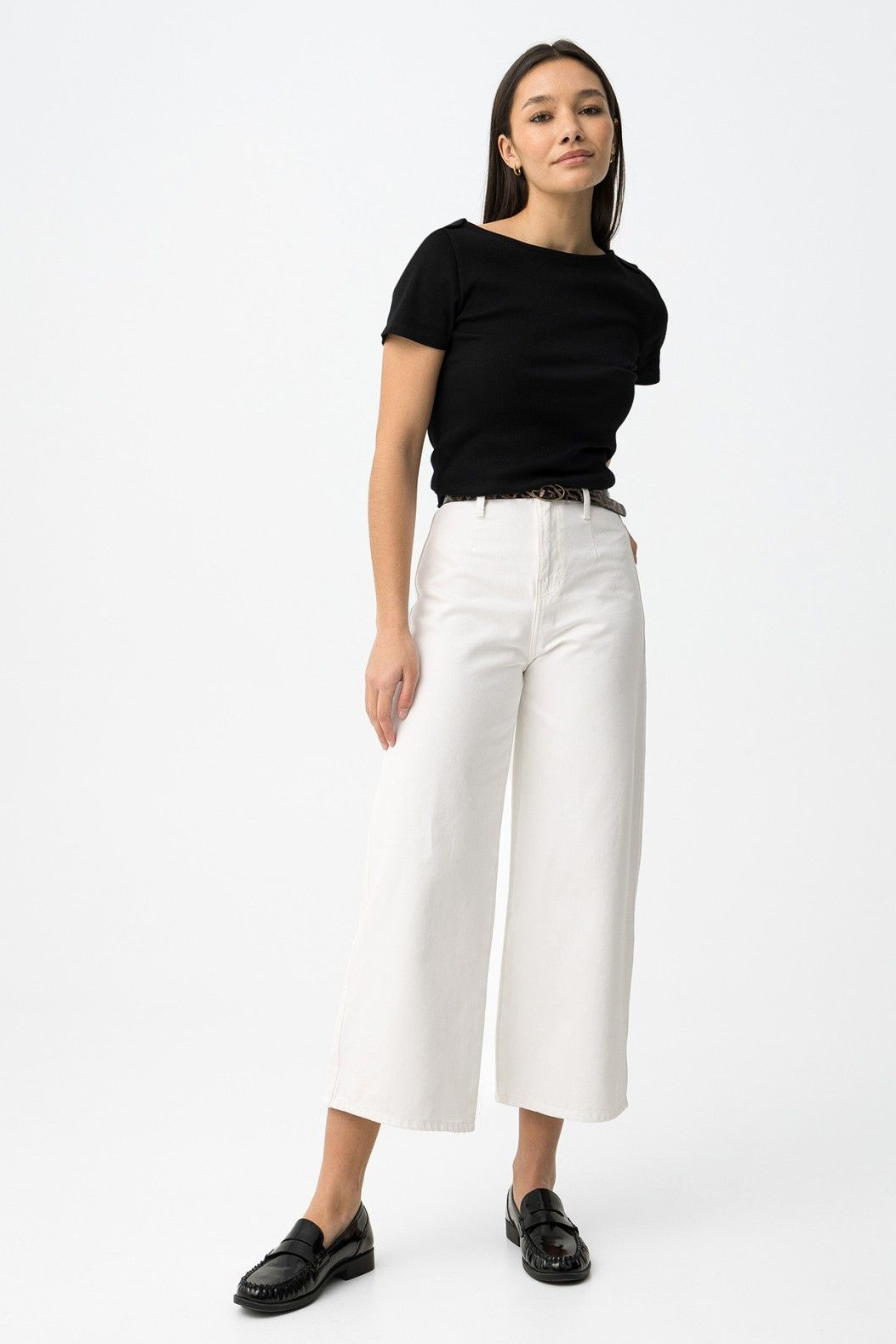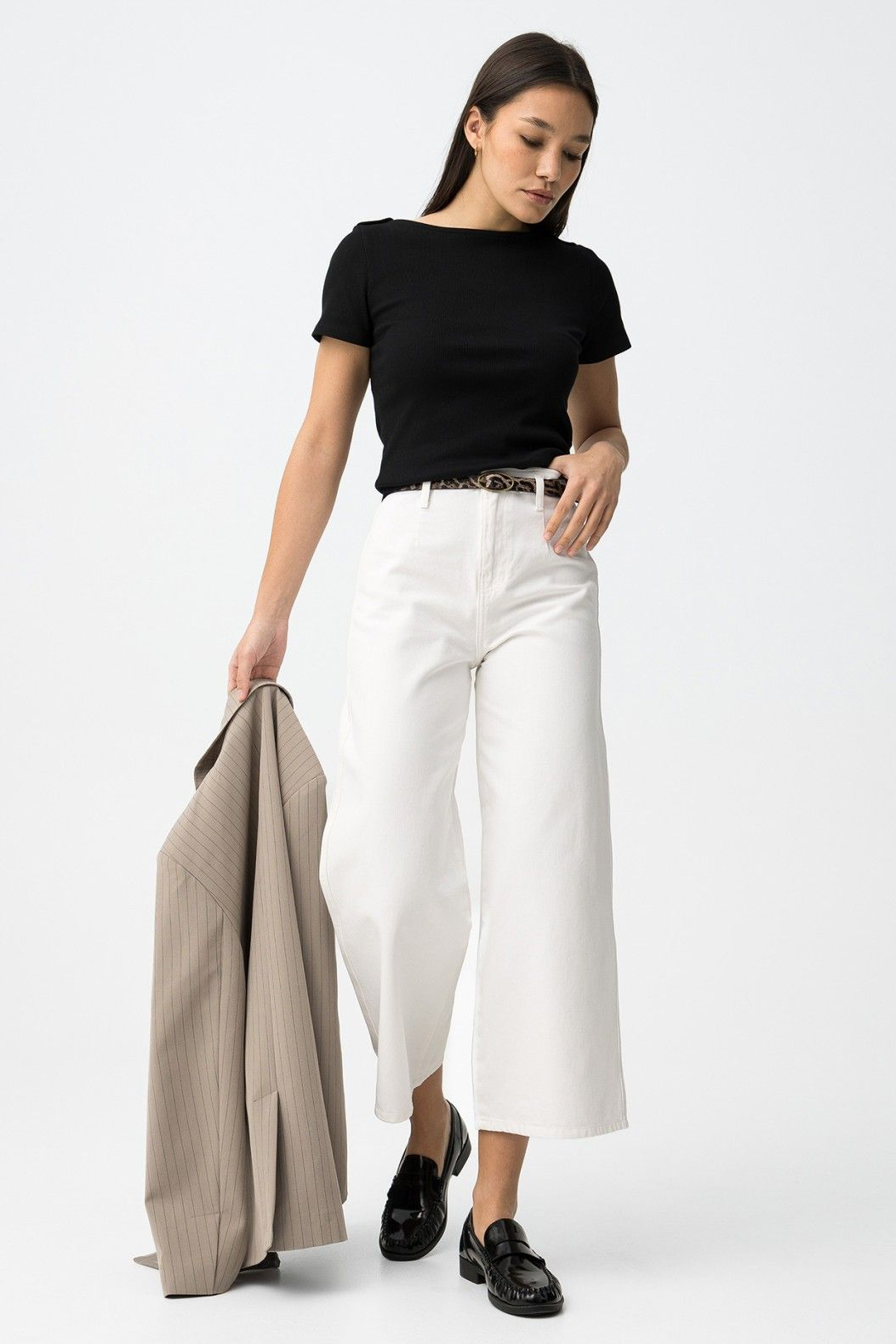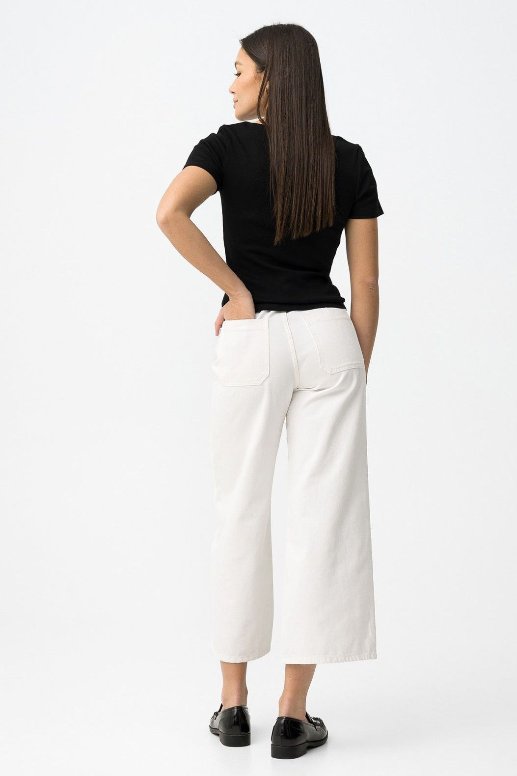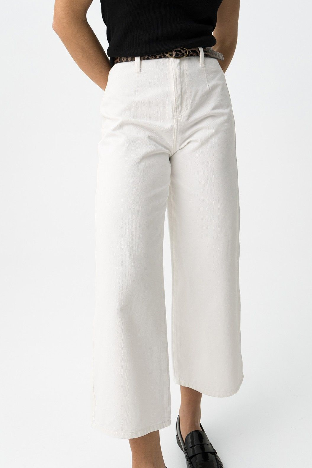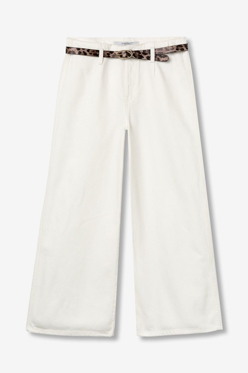 Calças de ganga brancas, corte cropped wide, com cinto estampado animal print e fecho frontal.100% COTTON