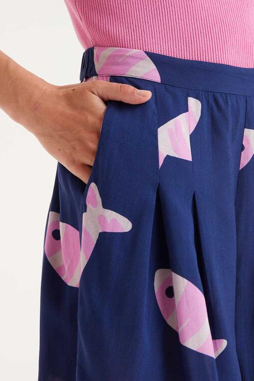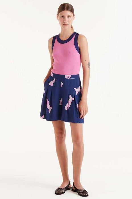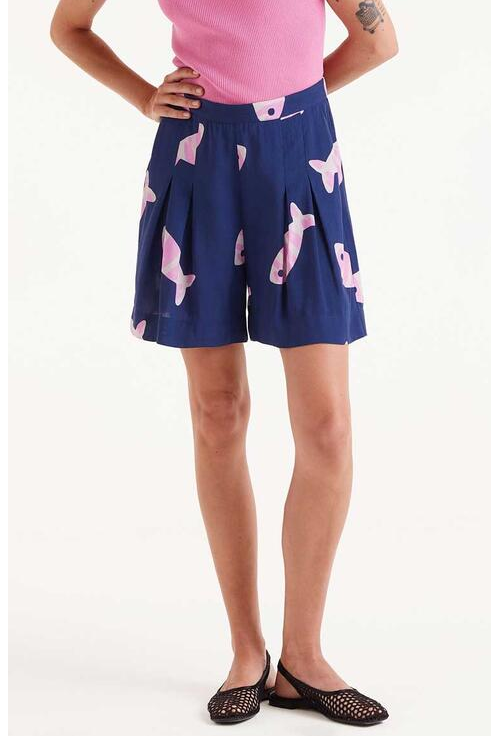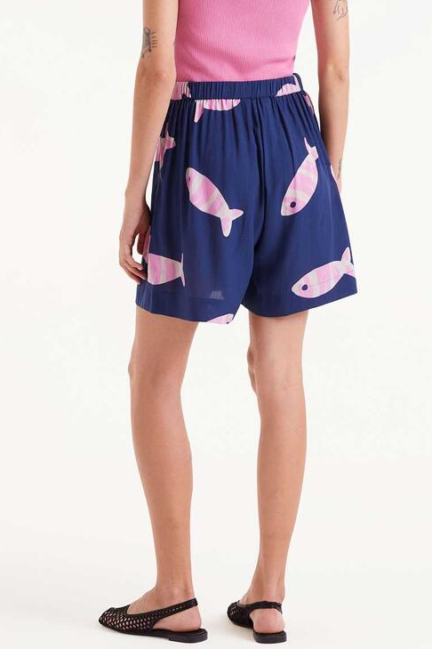 Pantalón corto en rayón LENZING? ECOVERO? con estampado Eureka. Con cintura fija frontal y elástica trasera de tiro medio. Detalle de pinzas frontales. Bolsillos laterales.