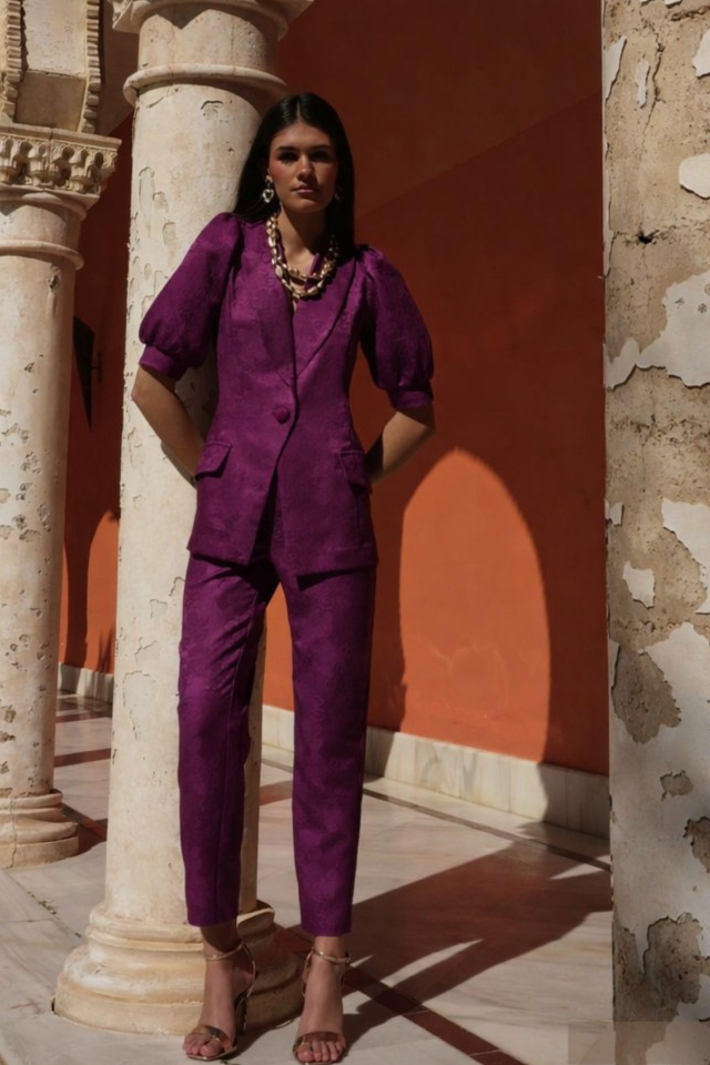 El traje Prune en tejido jacquard es una propuesta sofisticada y actual para eventos y celebraciones especiales. La chaqueta con solapa, botón forrado y mangas abullonadas aporta personalidad y delicadeza, mientras que el pantalón recto de tiro alto con cremallera realza la figura con elegancia. Perfecto para bodas, graduaciones, reuniones o cualquier evento especial, este traje permite crear un look moderno, estructurado y con carácter, ideal para destacar con estilo propio.